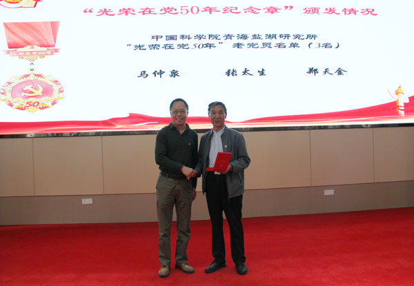 所長(zhǎng)吳志堅(jiān)為“光榮在黨50年”黨員代表張?zhí)绢C發(fā)紀(jì)念獎(jiǎng)?wù)隆nC發(fā)“光榮在黨50年”紀(jì)念章是黨對(duì)老黨員一生為黨和國(guó)家事業(yè)奮斗的集體致敬和最高禮贊,也是對(duì)廣大黨員不忘初心、砥礪前行的鼓舞激勵(lì)。今年全所黨員中共有3名老黨員獲頒紀(jì)念章,他們是黨員的楷模,是青海鹽湖所的驕傲,是全體鹽湖人的榜樣。