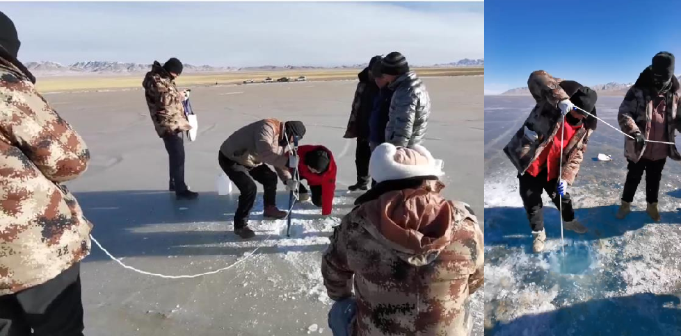 “三九四九不出手”,此時白天可可西里無人區(qū)的最高氣溫僅有零下15度,隊員們需要拿著鋼釬在湖面作業(yè),湖面結(jié)冰厚達(dá)1米多,隊員們克服嚴(yán)寒、鉚足全身的勁咬牙把鋼釬砸個十多次就開始上氣不接下氣了,氣喘吁吁的換下一個隊員砸鋼釬,大家輪番作戰(zhàn)。等湖水破冰而出時,隊員們又要克服嚴(yán)寒,沖洗樣品瓶,裝樣、封瓶。盡管戴著手套,但刺骨的湖水,凍得人只覺得鉆心的疼。有的時候砸下去90cm左右仍不見湖水,意味著這番努力白費了,隊員們需要繼續(xù)前往更靠近湖中心的位置,重新砸,等待破冰時刻。需要采集湖底沉積物時,考驗大家身心素質(zhì)的不只是砸鋼釬這項工作了,此時砸鋼釬只是前奏,隊員們輪番上陣,團(tuán)結(jié)協(xié)作的用鋼釬把冰面砸個大窟窿后,開始下重力鉆,一個重力鉆高達(dá)2米,重約20斤,砸到湖底采集到湖底沉積物后,比氣喘吁吁砸鋼釬更累的活才剛剛開始——拉裝有湖底沉積物的重力鉆孔。繩子被刺骨的湖水浸透拉到空氣中迅速結(jié)成冰,湖深往往在10米以上,而太陽湖的鉆取深度達(dá)到50多米,又是輪番上陣的接力賽,數(shù)著繩上的刻度咬牙堅持,不知何時隊員們的雙手雙腳早已失去知覺,戴著眼鏡的隊員,鏡片也結(jié)上了一層冰。湖底沉積物剛露出冰面,在短短的幾分鐘內(nèi)就會結(jié)成冰,屆時隊員們相互配合封口,才算是完成了一個湖底鉆孔的采集,短暫的松口氣后,又背著沉重的工具前往下一個采樣點。