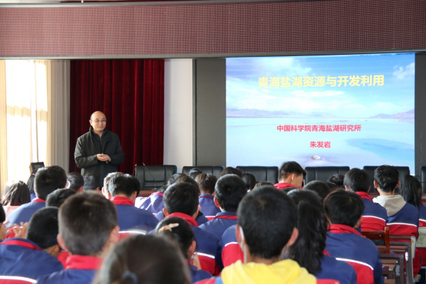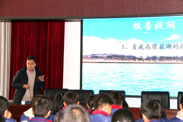 活動(dòng)中,九三學(xué)社青海鹽湖所委員會(huì)主委朱發(fā)巖以《青海鹽湖資源與開發(fā)利用》為主題,形象生動(dòng)地講述了“什么是鹽湖”“鹽湖在哪里”“鹽湖資源開發(fā)過(guò)程”等,使同學(xué)們對(duì)青海的特色優(yōu)勢(shì)鹽湖資源有了初步認(rèn)識(shí);同時(shí)還結(jié)合生活過(guò)程中 “大脖子病”“搶鹽大戰(zhàn)”等實(shí)例,向大家解釋了鹽的重要性和科學(xué)用鹽的必要性。朱發(fā)巖還結(jié)合自己在南門峽中學(xué)的學(xué)習(xí)經(jīng)歷,鼓勵(lì)同學(xué)們好好學(xué)習(xí),為將來(lái)服務(wù)國(guó)家和奉獻(xiàn)社會(huì)掌握知識(shí)、打牢基礎(chǔ)。